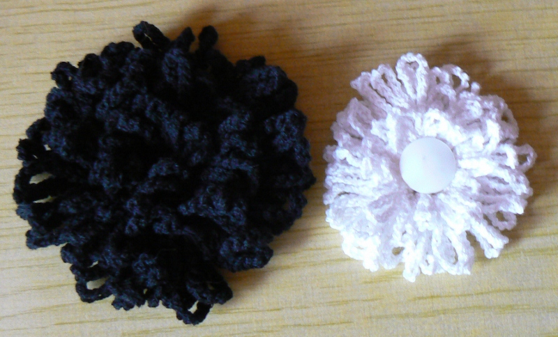 V týdnu jsme se se Světluškou 77 domluvily, že se budeme vzájemně podporovat v různých aktivitách. Tématem tohoto víkendu bylo dokončit nějaký rest. Vloni v létě jsem v galanterii sehnala klubíčko černé Poly a začala z něho háčkovat brož, práci jsem všem nedokončila a "rest" čekal v krabici. Včera večer jsem se dala do háčkování a kytičku dokončila. Dnes jsem vytáhla další barevné varianty a uvědomila jsem si, proč jsem v létě háčkování nechala. Příze byla tenčí než ostatní a tak jsem si použila dvojitě a černý květ je o něco větší.